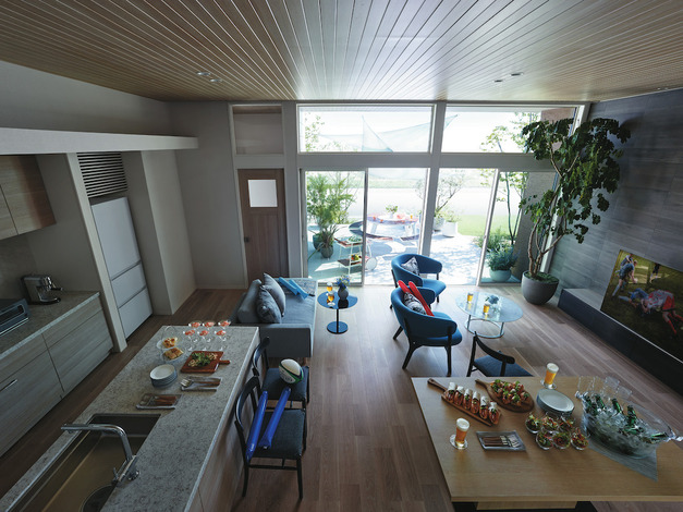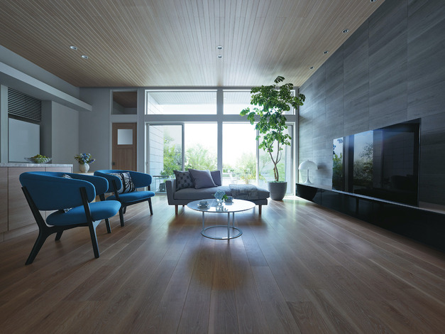 家族が集う時間が長いからこそ、リビングはゆとりの空間を実現したいもの。天井が高い開放的なリビングは、同社の家のシンボルのひとつだ。天井高3.3mの室内空間を実現するひとつの要素が、1階と2階の間にもう一層設ける大収納空間「蔵」の存在。開放感と暮らしに便利な収納空間を同時に叶える。素材感を大切にした内装や、住まい方に合わせた造作家具などハイセンスなインテリアも注目。