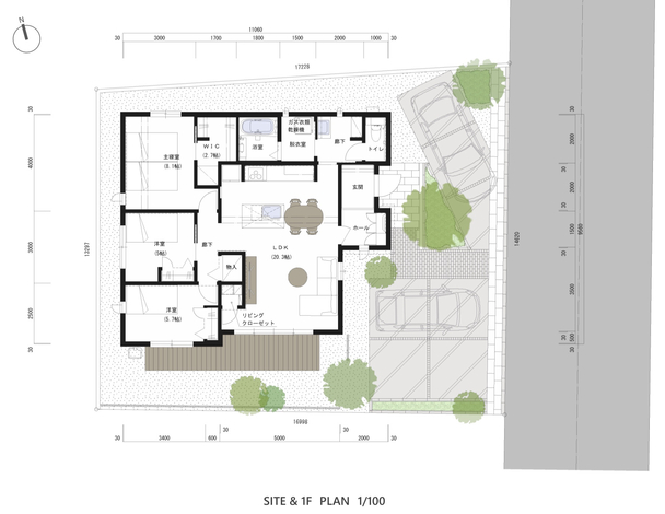 この2階建の5LDK間取りは、施主の要望を丁寧に反映しています。リビングは広く開放的で、自然光がたっぷり差し込む設計。庭やバルコニーとのつながりも重視し、家族が心地よくくつろげる空間を演出。明るく開放感あふれる生活が可能であり、自然と調和したライフスタイルを実現します。