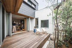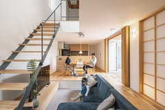 中庭で四季を楽しむ住まい。段差がりで広さを感じ、中庭へと緩やかにつながる、心ほどくリビング空間が特徴。四季を感じるお庭と、テラスが気持ちいいのお家です。