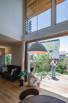 ご購入された土地は、大きく窓を取りたい南側に隣家が建っており、いかに室内に光を取り込むかが課題でした。ダイニングの吹抜けとダイナミックな“段窓”をご提案し、プライバシーを確保しつつ十分な採光を実現しました。