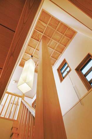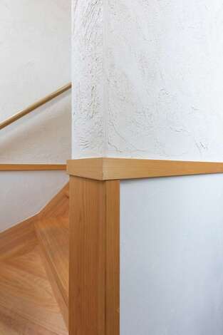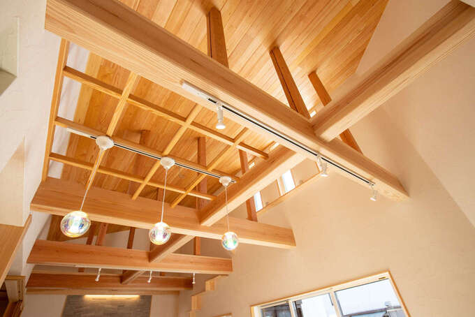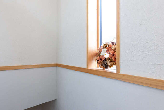 長年の実績で信頼関係を築いた仕入れ先から、一本一本吟味して直接仕入れる国産の杉やひのきの無垢材は、人工乾燥の木を使用せず、自然乾燥させたの無垢材のみを標準で使用する。なかでも、梁、柱、窓枠、幅木、化粧材などに使うヒノキは、見た目の美しさと耐久性に優れる奈良県吉野産が標準仕様だ。森林浴で感じられるような癒しや消臭・防虫に効果的な芳香成分は、伐採された木にも残っている。とくに、じっくりと自然乾燥させた無垢材にはこれらの成分が多く残るため、長い間木の香りが漂い、その効果がもたらされる住まいを叶えてくれる。さらに合板も一切使わないため、一部接着剤によるシックハウス症候群などの心配もない。また、室内の塗り壁には、防虫効果や自浄効果が高い100%スペイン漆喰を採用している。