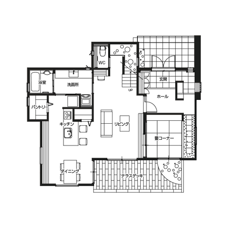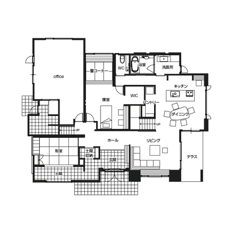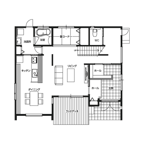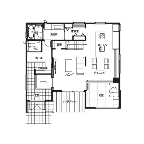 ダイニング、キッチン、洗面、浴室、ウッドデッキを一直線に配置しコンパクトにまとめることでスムーズな家事動線を描くことができます。お料理や洗濯などの家事を同時にこなすことで、時間の短縮につながる工夫をしました。 玄関の大容量シューズクローゼットには靴はもちろん、スポーツの道具やコートまでも収納することができます。2階の小屋裏収納やウォークインクローゼット、ロフトには季節の家電や洋服を。他にもキッチン、畳コーナー、洗面など家中に収納がいっぱいあります。