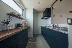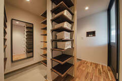 玄関には靴の量が多いSさん夫妻のために大容量のシューズクローゼットを造作。キッチンから目が届く位置にスタディコーナーを設置した。キッチンが暗くならないよう北側に大きめの窓を配置している