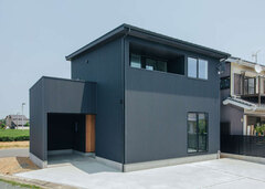 三角形の変形地に完成したS邸。視界が開けた角地のため、開放感を得ながらも、外から室内が丸見えにならないよう、建物の配置を工夫してプライバシーを確保。建物一体型のバイクガレージのあるこの家のテーマは「大人のアメリカンカジュアル」。無垢材を贅沢に使ったLDKは、要所にブラックを取り入れてインダストリアルな雰囲気に。夫婦ともにファッション好きなため、収納スペースをたっぷり確保し、全身鏡も1階と2階に設置した。また、家事時間を短縮するため、2階にランドリールーム+部屋干しスペースを配置。洗濯家事の移動時間をゼロに。自由設計、ガルバリウム外壁、無垢床が標準仕様の家を、無理のない価格で建てられるのも『DAITOKU』を選んだ理由のひとつだ。さらに、初期費用0円の太陽光発電システムにより光熱費も大幅軽減。建てるときはもちろん、建ててからもずっとお得が続く家で、新築後の暮らしにもゆとりが生まれ、安心・快適な暮らしがこれからも続いていく。