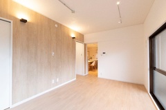 リビングのアクセントウォールを間接照明で照らし、スタイリッシュな印象に。子どもが小さいのでキッズコーナーを仕切ってあるが、空間自体が広々としているため、狭苦しさを感じない