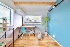 階段を上がってすぐのオープンな空間に書斎コーナーを造作。PC作業など、家族のだれでも使える共有スペースに