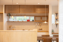 デザインと家事効率を両立したオープンキッチンと造作棚。調理しながら家族の顔が見渡せ、横にスライドして配膳できるレイアウトでママの負担を減らし家事ラクなつくりに♪