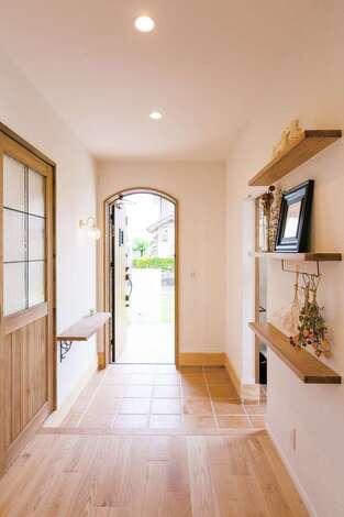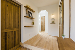 自然素材のぬくもりに、雑貨や垂れ壁が映えるあたたかなエントランス。ヴィンテージ感のあるガラス照明が壁に灯りを映し出しあたたかな雰囲気を演出しています。