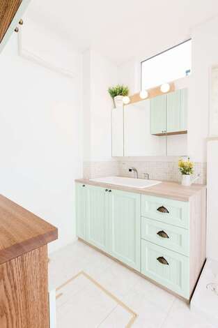大人かわいいデザインとともに、主婦目線で設計された家事動線と大容量の収納など「あったらいいな」を詰め込んだ家。南面の大きな窓からたっぷりの光を招き入れる吹き抜け。1階にいても2階にいても家族の存在を感じられる居心地のいい空間に。