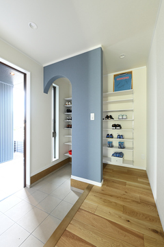 玄関を広くすることで、自転車やベビーカーを置いても楽々と靴を脱ぐことができます。 キッチンを中心にぐるぐる回れる回遊動線で家事ラクな間取りに。 1階にファミリークローゼットを設けることで、階段の昇り降りの回数を減らすことができ、朝の身支度も時短できます。