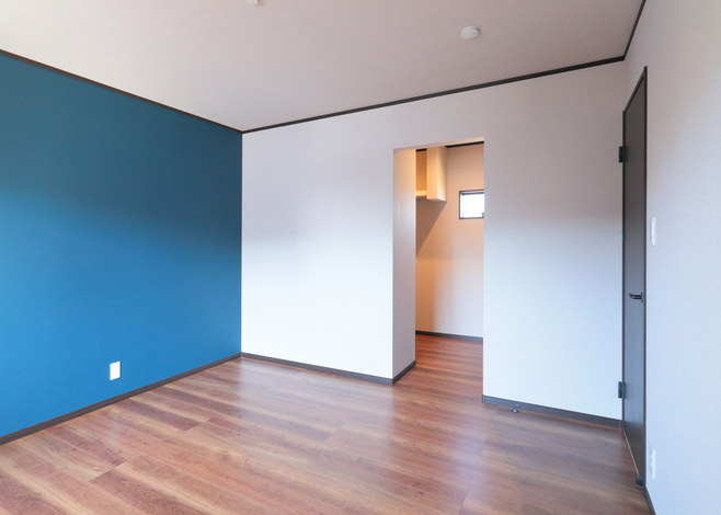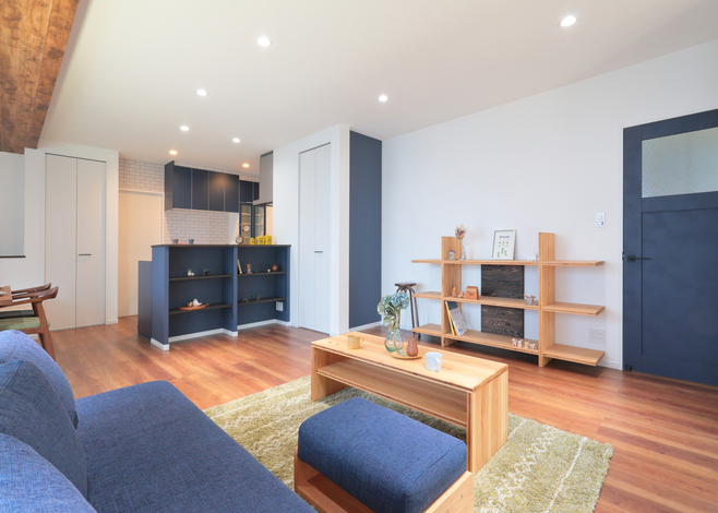 子世帯のLDKは約23畳の大空間。要所要所にブルーを取り入れた。大開口を開けるとウッドデッキと直結