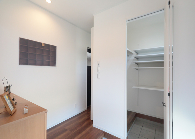 子世帯の玄関ホール。収納スペースも充実。親世帯と玄関を離したことで、いつでも気軽に友達を呼べる