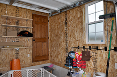 最近の『ブルーハウス』の施工物件の中でもかなり造作部分が多いお住まいで、細部までこだわってデザインさせていただきました。特にガレージの扉は、外観の大事な部分だったので、お施主さまのイメージをもとにサイズや型ガラスの位置をデザインし、取手もセレクトしました。