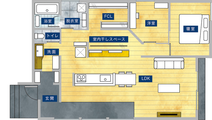 玄関ホールから、リビングにはもちろん、キッチンへも行ける回遊型の間取り。ランドリールームを兼ねた洗面脱衣室と、キッチン背面のファミリークローゼットの距離が近いため、着替えなどの身支度や洗濯家事もスムーズに行えます。