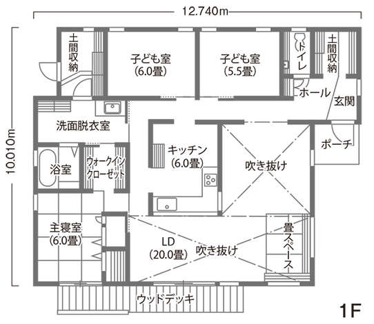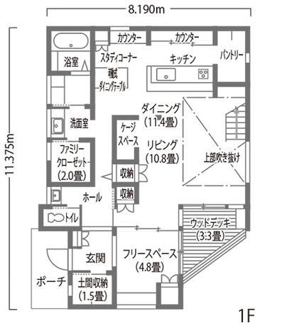 吹き抜けの大開口を通して2Fのフリースペースまで巻き込み、家全体を1つの空間に。いつも近くに家族の気配を感じられる間取りです。