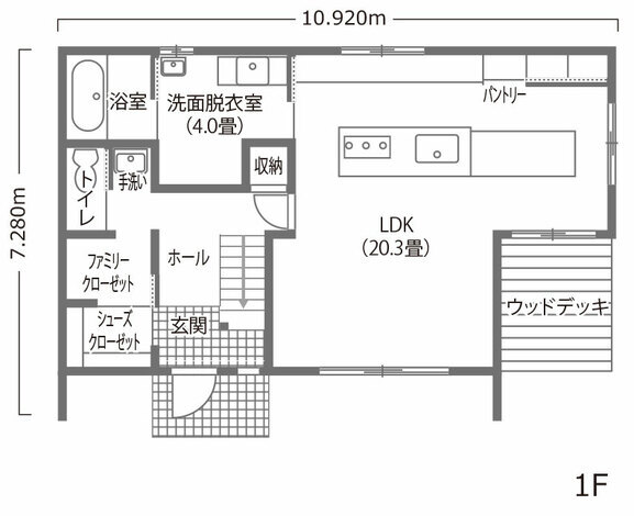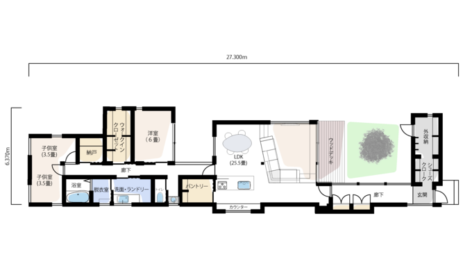 玄関からシューズクローゼット、ファミリークローゼット、手洗い、洗面脱衣室、浴室、そしてLDKへとノンストップでつながる回遊動線で家事を時短。なるべく家族全員が1階で過ごせるよう、子ども部屋はあえてコンパクトに抑えました。