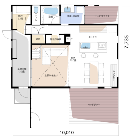 シンプルな家事動線と開放感あふれる吹き抜けのある間取り