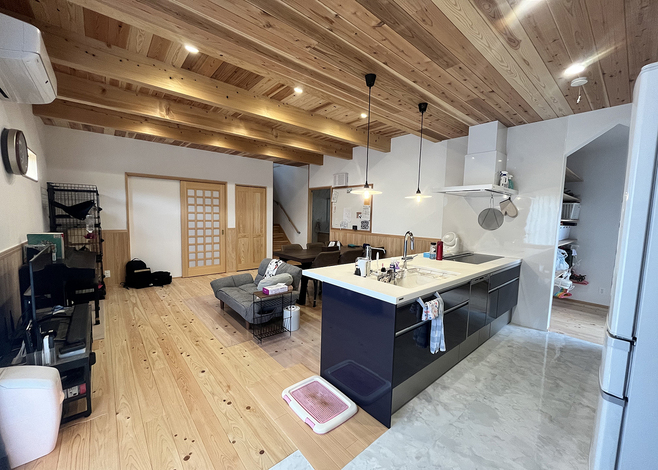 スギ、ヒノキ、マツなどの国産材の中でも、地元の三河で育った無垢材を積極的に採用。耐久性、耐水性、強度など、それぞれの木が持つ個性を生かしながら、構造はもちろん、天井や壁にも自然素材をふんだんに使った家づくりに取り組む。無垢板のカウンターや棚などの家具、建具の造作も『松澤建築』が得意とするところ。施主さんの要望と予算に合わせて1からつくり上げている。