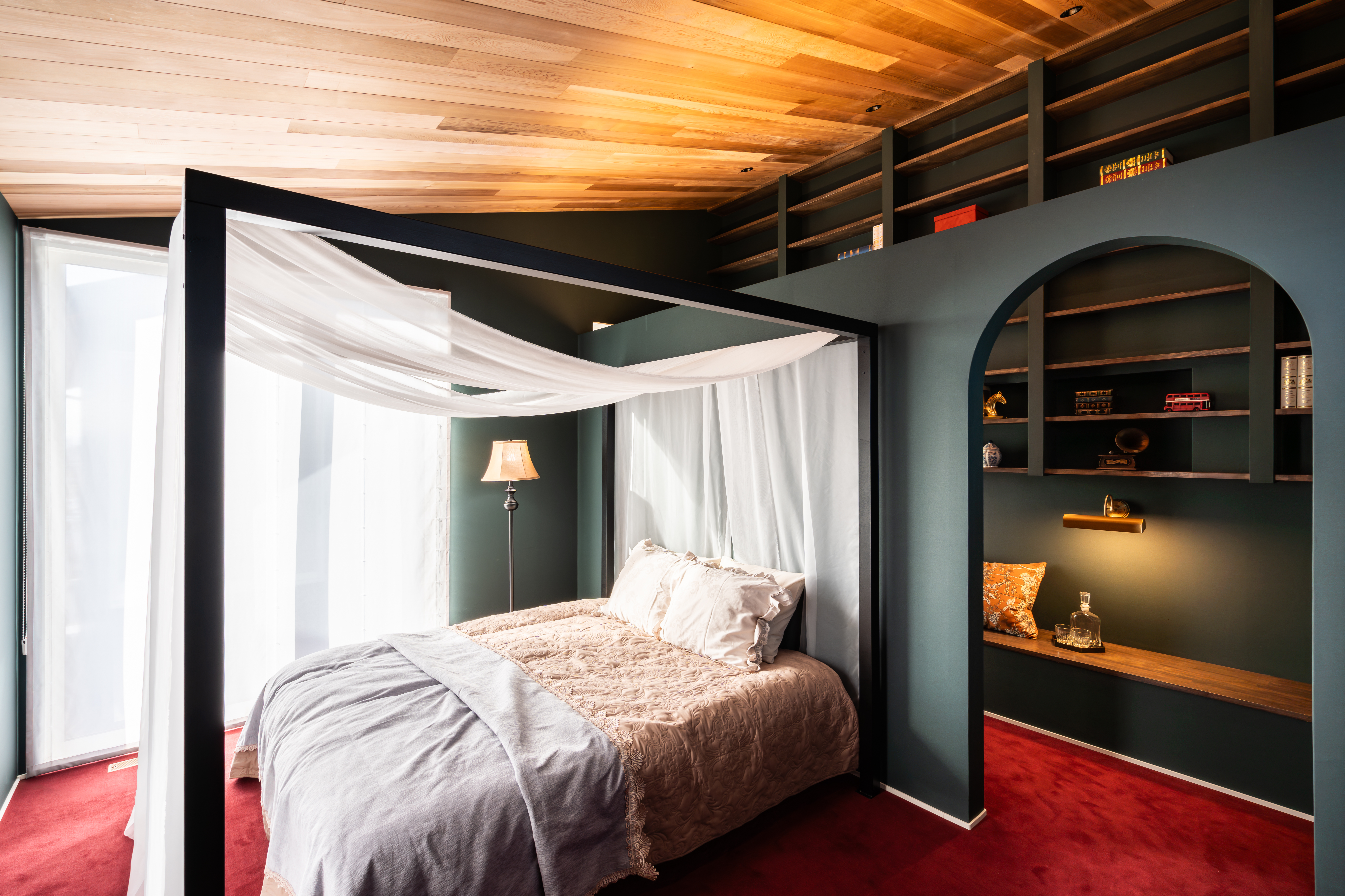壁一面に大きな本棚。通路を抜けると一日の疲れを癒すこだわりのベッドルーム。まるで映画の世界へ来たかのように自分好みにアレンジ。