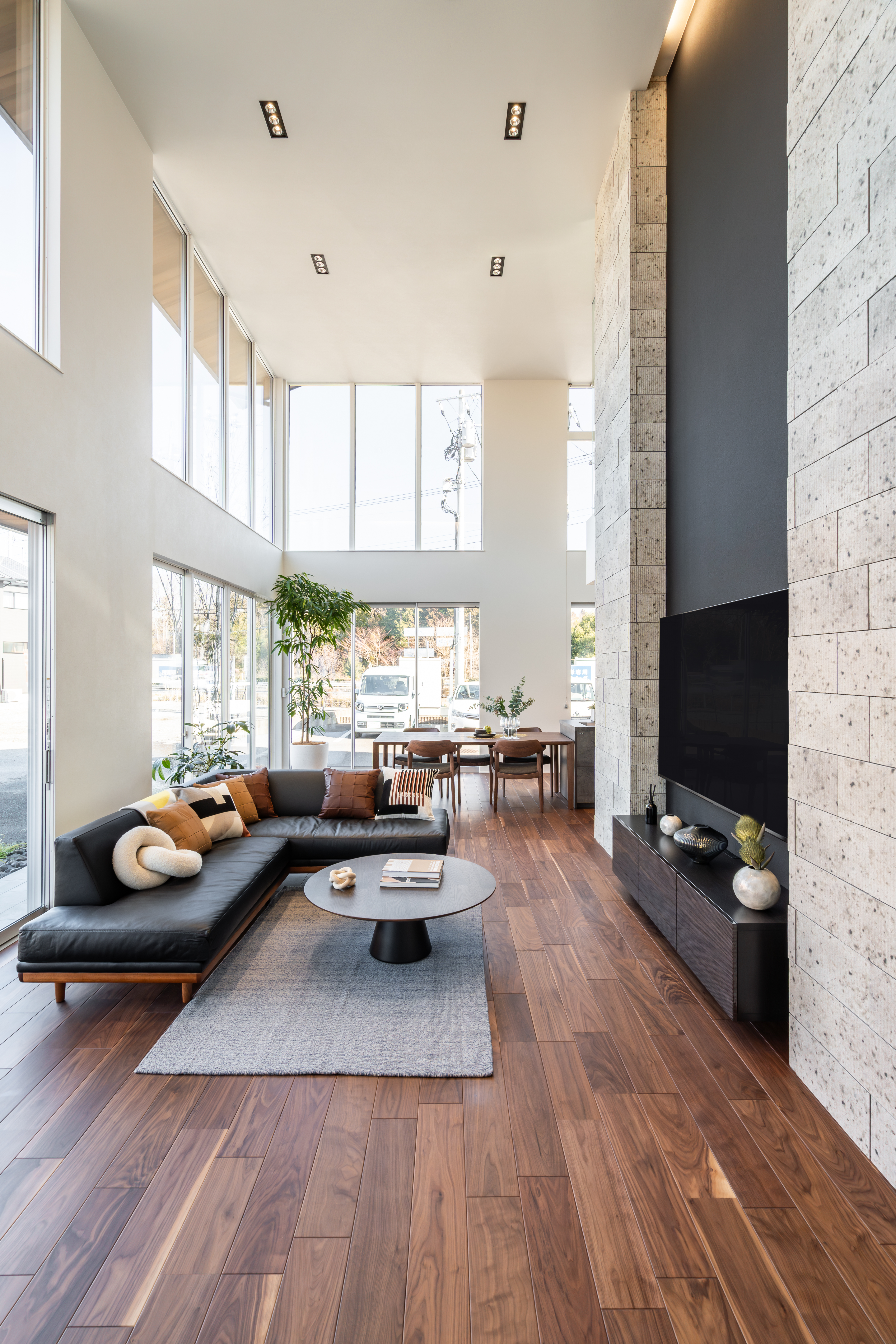 吹き抜け高さ5.5mの大空間と大きな窓を最大限に活用し、柱や間仕切りも極限まで取り除いた「超」開放的なリビング。内装に地元宇都宮の大谷石を大胆に貼り、高級感に加え居心地の良い空間を演出。