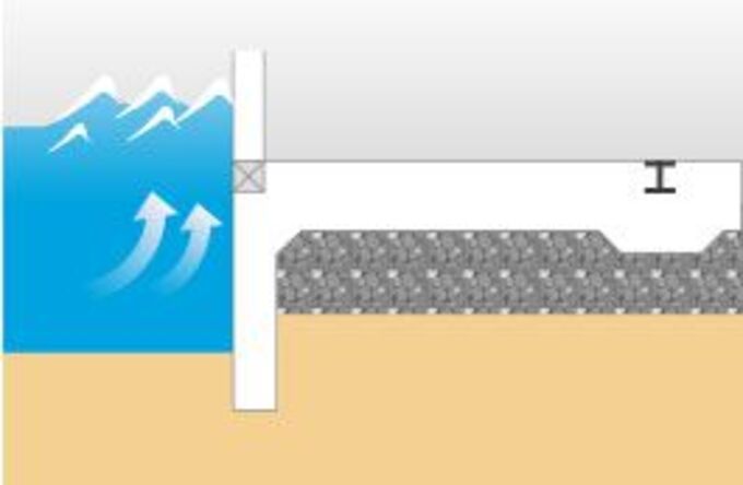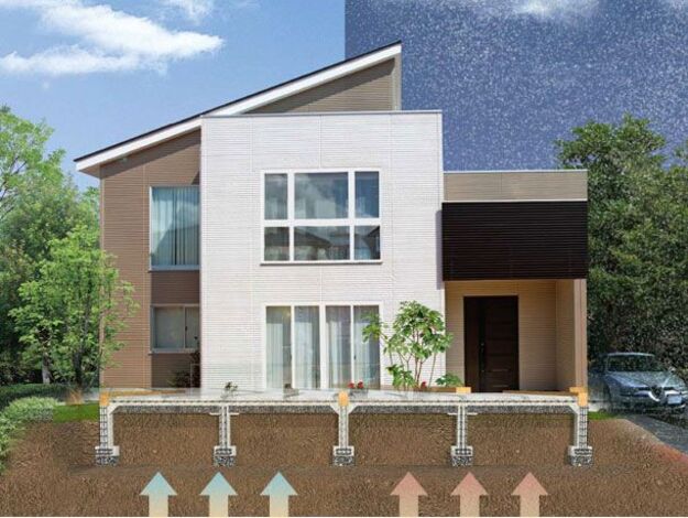 「地熱床システム」とは、地面と床下に砂利を敷き詰め密閉し、その上をコンクリートで仕上げた工法。季節や天候に左右されにくい地熱を利用することで、真冬の15℃から真夏の25℃の範囲を安定して保つため、天然の冷暖房効果をもたらし、一年を通して快適な室内環境になる。また、敷き詰められた砂利が振動を吸収、分散する緩衝材の役割を果たしてくれる。床下の空間がないため、雨水の浸水や土砂・廃棄物の流れ込みを防止。一般的な基礎よりも改修費用が大幅に軽減され、お客様の負担を最小限に抑えます。