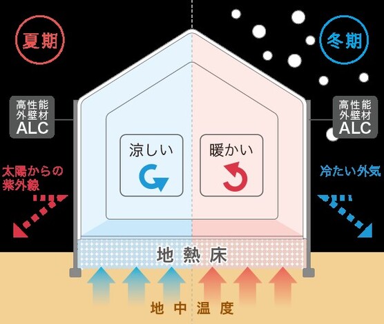 耐火・断熱・耐久・遮音など8つの複合性能を高水準で備える外壁材「ALC」を標準採用。「地熱床システム」との相乗効果により、快適で暮らしやすく、省エネルギーにも貢献する。これだけの高性能ながら、珪石・石灰・セメントなどの自然素材を使用した地球にやさしい建材であることも魅力だ。