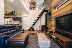 開放的な空間を活かしたLDK。木製のアクセントウォールが特徴で、スタイリッシュなインテリアが魅力的。アクセントとなるアイアンの階段はヒトではなくネコちゃんの為のもの。自由気ままに行ったり来たりを楽しみます。ダイニング