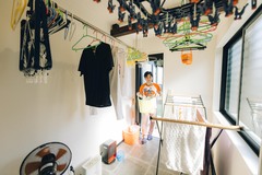 共働きのため、家事は出来るだけスマートに。洗面脱衣室の南側に3畳の物干し場。1階にあるお風呂と洗面脱衣室で洗った物を2階のバルコニー に干す、従来の方法から脱却です。家事時間がスマートになると、みんなの時間と趣味の時間が多く取れます。自分たちの好きなコトや、好きなモノに多く触れ合っていたいH様。