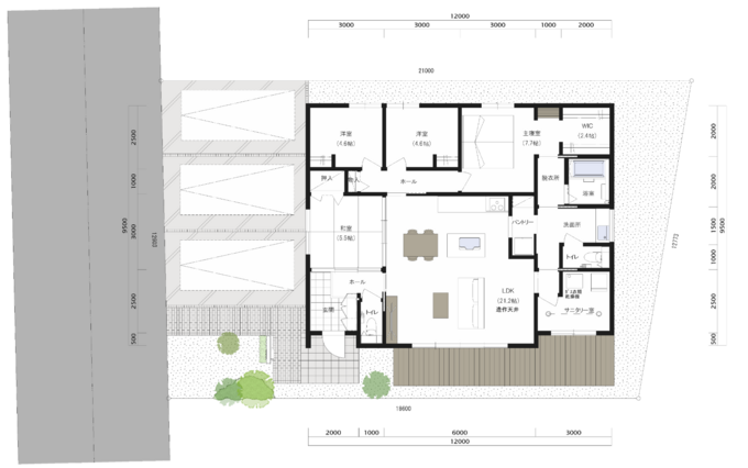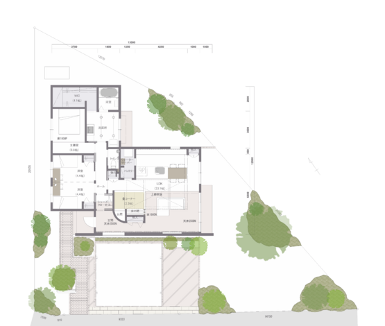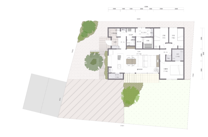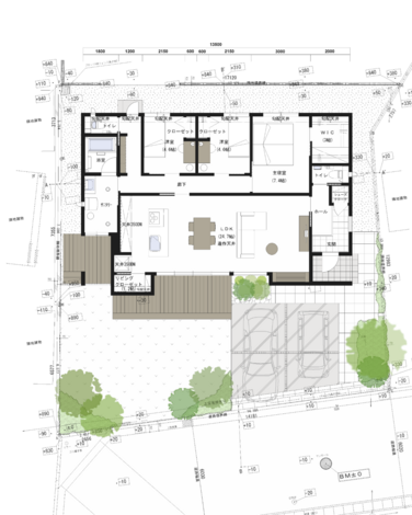 この3LDKの平屋は、施主の求める開放感と自然な空気の流れを考慮し、心地よい暮らしを提供する設計となっています。リビングに設けられた開放的な吹き抜けが、視覚的な広がりと共に風の通り道を生み出し、住まい全体に爽やかな空気循環をもたらします。また、土間とリビングが続くデザインは、内外の繋がりを感じさせ、ゆったりとした生活空間を実現。さらに、各部屋の動線も工夫されており、家事を効率的に行える導線を確保。これにより、日々の家事時間を短縮し、家族との楽しい時間をより多く持つことが可能になります。施主のライフスタイルにぴったり寄り添ったこの間取りが、暮らしに豊かさを添えます。