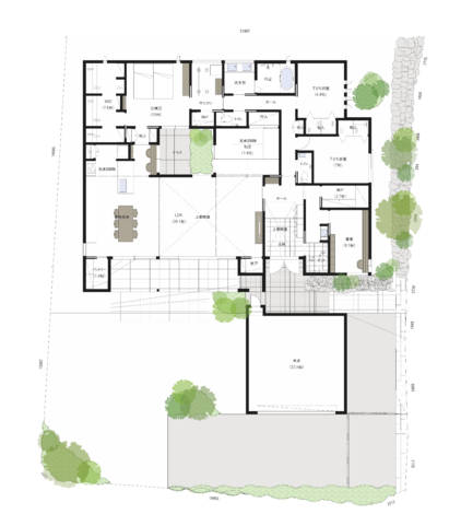 この2階建の5LDK間取りは、施主の要望を丁寧に反映しています。リビングは広く開放的で、自然光がたっぷり差し込む設計。庭やバルコニーとのつながりも重視し、家族が心地よくくつろげる空間を演出。明るく開放感あふれる生活が可能であり、自然と調和したライフスタイルを実現します。
