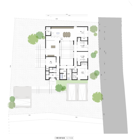 お施主様の夢を形にするためにデザインされたこの4LDKの平屋は、ガレージからのスムーズなアクセスと、日々を快適に過ごすための広々としたリビングを特徴としています。リビングには開放感溢れる吹き抜けを取り入れ、自然光がたっぷりと差し込む空間を実現しました。ゆったりとくつろげるリビング空間は、ご家族が集い、リラックスできる場として理想的です。さらに、仕事部屋として使えるスペースを設けることで、生活と仕事の両立が可能になり、プライベートと仕事の境界を意識的に設定できます。中庭も備えており、家全体に爽やかな空気と光が行き渡る設計です。この間取りは、贅沢な開放感と心地よさを求める施主様のライフスタイルを実現しています。