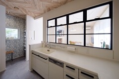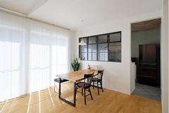 リビング・ダイニングとキッチンを、アイアンのおしゃれな室内窓で緩やかにゾーニング。Iさんがイメージしていた通り、独立した一部屋のような感覚でキッチンを使うことができるものの、お互いに相手がいま何をしているかが見えて安心感があるキッチン