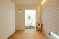 その夢を形にするため、玄関正面に坪庭を設け、景色を印象的に切り取る大きなガラス窓をはめ込んだ。壁には陰影が美しく出るエコカラットをあしらっている洗面スペース