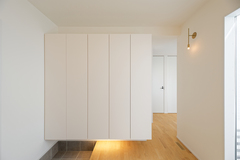 シンプルでおしゃれな雰囲気をイメージした、スクエアのフォルム×白×木目の外観。上げ下げ窓とスリット窓をアクセントにすることで、シンプルでありながらも目を惹く、個性的なデザインに仕上がった。玄関ホール