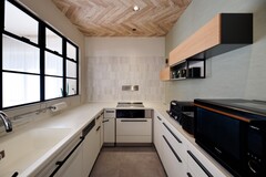 室内窓で空間を仕切るクローズドスタイルを選択し、コの字型キッチンを採用。コの字型+IHにすることで作業スペースが広がり、IH専用のスリム換気扇で見た目がすっきりしたのもお気に入りキッチン