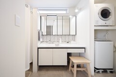 ランドリールームと洗面室を兼ねた、広々とした機能的な家事空間。ガス衣類乾燥機にかけた洗濯物は洗面台横のカウンターで畳んで、下のBOXにそのままサッと収納できる外観