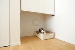 リビング収納の下部スペースに換気扇を設置した、猫ちゃんのトイレ空間。玄関ホール