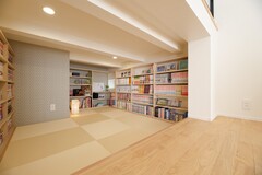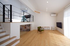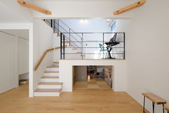 リビング内に家族が思い思いの過ごし方ができるスキップフロアを設計。上はワークスペース、下は畳敷きの漫画コーナーと、横から見ると2階建てのお家のように見えて遊び心たっぷり。LDK