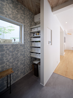 リビングから死角になる1帖のパントリー。生活感が出る食品や日用品をストックでき、リビングをすっきり見せる。スキップフロア
