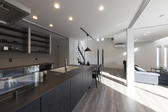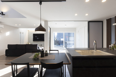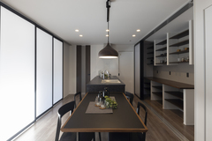 モダンなデザインのダイニングスペース。落ち着いたトーンのインテリアと洗練された照明が、居心地の良い食事空間を演出している。LDK