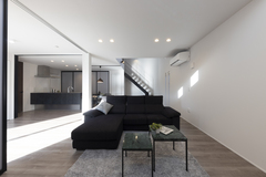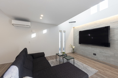 シンプルでスタイリッシュなリビングルーム。広々とした空間に大きなソファと壁掛けのテレビが配置され、快適なリラックス環境を提供している。LDK
