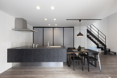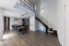 モダンなデザインのLDKスペース。シンプルなダイニングテーブルとキッチンが空間をスッキリと見せ、階段がスタイリッシュなアクセントとなっている。LDK