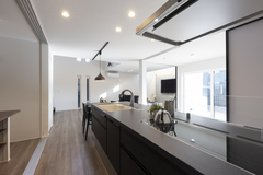 開放感あふれるLDKの空間。モダンなデザインのキッチンが、リビングやダイニングと一体となり、家族の交流を促進するレイアウトである。LDK
