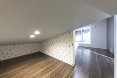 天井が低く、コンパクトなスペースのロフト。窓から光が入り、小さながらも明るい空間を提供。壁のアクセントクロスが個性的で、居心地の良さを演出している。45坪の2階建て、木造軸組工法で建てられたこの家は、建築家の手によってフルオーダーで設計されたシンプルモダンな住宅である。広々とした洗面スペースには、充実した収納棚と大きな鏡があり、朝の身支度を快適にする。また、開放感のあるLDKは高い天井とたっぷりの自然光が魅力で、家族が自然に集う暖かい空間である。モダンなキッチンとリビングが一体となり、家族の交流を深める。全体的に落ち着いたトーンのインテリアが、シンプルでありながらもスタイリッシュな居住空間を提供している。