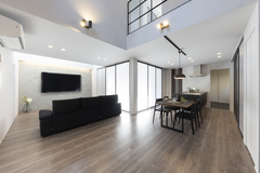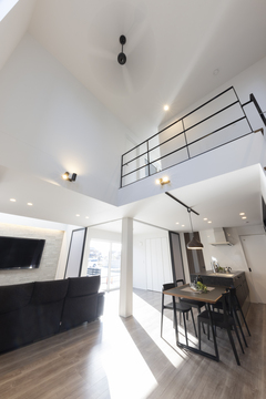 吹き抜けのある開放的なLDK。モダンなデザインとスタイリッシュな家具が、洗練された空間を演出している。明るい光が差し込む快適なリビングデザイン。LDK