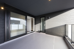 モダンで広々としたバルコニー。ガラスパネルの手すりが採光をさらに良くし、落ち着いた色合いの壁面が洗練された雰囲気を演出。居室