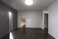 モダンな雰囲気の居室。シンプルなデザインで、収納スペースも設けられており、使いやすさと快適さが計算された空間である。ウォークインクローゼット