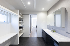 広々とした洗面スペースは、収納棚と大きな鏡を備えており、機能的で使いやすいデザインが特徴である。白を基調とした清潔感のある空間で、毎日の準備が快適になる。LDK