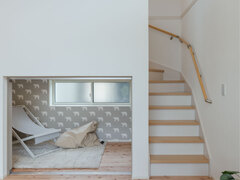 階段下を有効活用した、多目的な広すぎ収納スペース。可愛らしい柄のクロスと木目調の床が、温かみのある空間を演出。小窓からの自然光で明るく、開放感も確保。ウッドデッキ