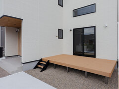 リビングに直結したウッドデッキ。家族や友人とアウトドア料理やリラックスを楽しむためのスペース。オープンガレージ
